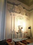 Pedestal liso con incrustaciones de ornamentos y molduras.